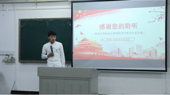 随后,电气系学生党支部组织委员傅青达从“外敌入侵,应对失策”、“模样示范,新生力量”及“中国共产党的诞生”三个方面讲述了中国由积贫积弱走向繁荣复兴的过程,绘出一段波澜壮阔而又艰难曲折的奋斗历程,昭示了中国共产党“为中国人民谋幸福,为中华民族谋复兴”的初心与使命。接着他又为新生介绍了入党的相关流程与注意事项,并阐述了党对人民、社会及国家的重要意义。