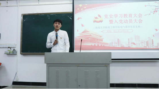 最后,青年委员廖伟杰鼓励新生积极主动地学习党史和党的基本理论,号召他们以自己的实际行动主动向党靠拢,并代表电气系学生党支部向新生们提出学习及生活上的相关建议,期待他们能够保持初心,不负韶华,努力前行。