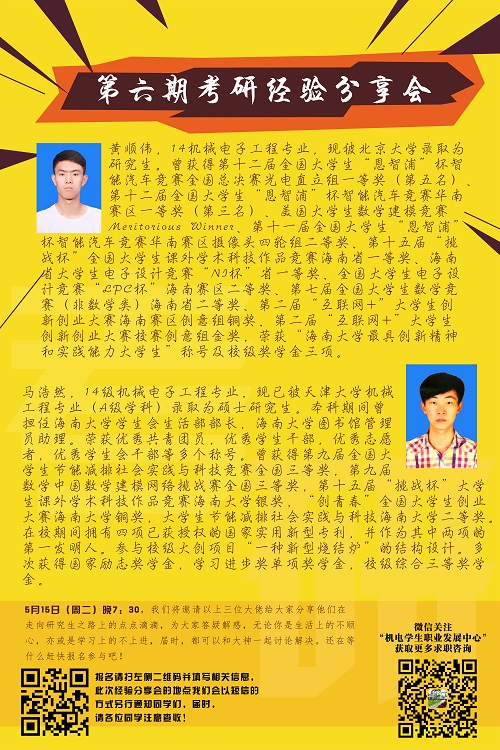 为帮助同学们明确考研备考思路,确立科学复习规划, yl7703永利于2018年5月17日晚7:30在研发楼417,成功举办了第五期考研经验分享会。出席分享会的有考取北京大学的黄顺伟和考取天津大学的马浩然两位学长,参加分享会的有十余名想了解考研相关知识的同学,会议由职业发展中心的韩圣主持。