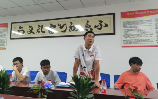 随后,实践队长何治国同志对本次社会实践活动相关内容做出了详细介绍。主要分为四个方面。第一个方面是明确了本次活动主题;第二个方面是对本次黎苗文化调研活动具体行程及时间安排进行了详细介绍;第三个方面是结合活动主题对各个小组及每名成员的任务进行了更明确的分工;第四个方面则是再次强调外出需要注意的安全问题等。