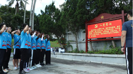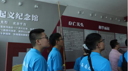 随后,调研团前往白沙起义纪念馆参观学习。在白沙纪念馆前伫立着黎族人民的领袖王国兴同志的雕像。作为一名优秀的共产党员,他为了谋求黎族人民的解放组织并领导了白沙起义。他历尽艰辛去寻找中国共产党,在党的领导下,为海南岛抗日战争和解放战争的胜利做出了重大贡献。进入纪念馆内,详实的文字、图片、实物等史料,再现了白沙起义的历史画卷,让人们能够深入了解白沙起义的光辉历程,更加铭记这段艰苦岁月,缅怀和纪念为其作出重大贡献的黎族人民的杰出代表和在起义中牺牲的英烈们,时刻牢记着没有共产党就没有新中国,使爱国主义思想和民族团结精神代代传承,为推进海南又好又快发展和民族地区的新跨越而努力奋斗。走出纪念馆,调研团全体成员在黎航老师的带领下重温入党誓词。