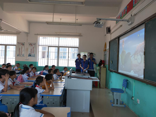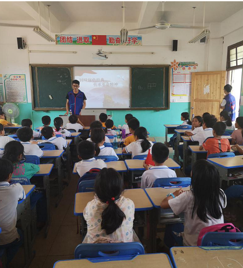 支部成员们在下午14:30从海南大学北门乘坐大巴出发,前往大林小学。海南的四月,虽然天气异常炎热,党员们却热情不减。在课堂上,支部成员们首先通过有奖知识竞答的方式,生动有趣地为同学们介绍了什么是红色精神、五四爱国运动、红色经典与革命精神,随后播放了相关的视频引导同学们一起探讨学习。支部成员们共同表演了以“五四爱国运动”为主题的话剧,再一次带领大家体会这场具有里程碑意义的革命运动中,爱国青年们勇于奉献,不怕流血牺牲的伟大精神!
