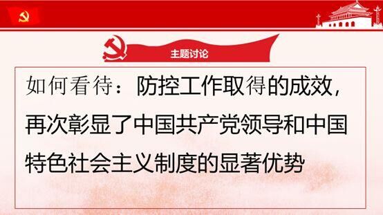 主题讨论气氛热烈。全体同志结合疫情防控工作进行了主题讨论,支部预备党员朱叶红同志发言说到:今年的疫情让我感触最深的就是祖国的团结和凝聚力,我的家乡在安徽省的一个小村庄里,即使这样,我还看到村子里一遍一遍的通知,听到村里喇叭一遍一遍的播放,让大家不要聚餐不要外出,这些都让我看见了大家都在努力为国家做贡献,都期盼着祖国母亲早日恢复健康。整个社会的运转是一个复杂的系统构成,我们所能做的就是在自己的岗位上做好自己,把自己的工作做好,对社会问心无愧,这也是一种平凡中的伟大。在祖国的号召下,千千万万的共产党员,站在防疫一线,我们人民也在政府的号召下,积极配合乖乖巧巧的呆在家里,祖国哪里有需要,我们的劲就往哪儿使,团结奉献共克时艰,这些都让我们看到了我们党领导下我国的制度优势和基层党组织的战斗堡垒作用。其他的同志也都纷纷表示,要做到“发挥模范作用、带头防控疫情、从自身做起、从家庭做起”。