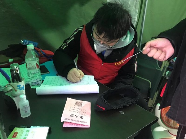参加防控工作后,我们3名志愿者帮助工人师傅在卡点建起了简陋的帐篷。作为志愿者主要负责白天协助团委领导值班,为社区因私事出入人员填写出入证、检查外出工作人员的工作证明并测量体温。从团委的王书记口中得知,我所在的社区情况十分特殊:有约400户人家、1000余人口,其中有两户人家分别从高风险地区周口与武汉返回;社区靠近妇幼保健院,产妇孕检出入和家人探视十分频繁。疫情防控的前期缺乏经验,难免有些手忙脚乱,尤其是中午时段,厚厚的一本信息登记表短短一中午就见了底。随着疫情防控健康码逐渐推广,志愿者的工作简洁快速有效,但是“出去扫过了为什么回来还要扫码”、“我是老年机,不能扫码”诸如此类的问题仍旧层出不穷,有时虽然向同一个人解释多次,但是还是要耐心向他们讲解、期望他们的配合与支持。
