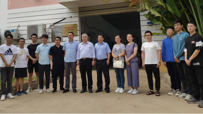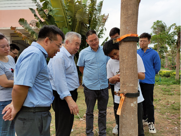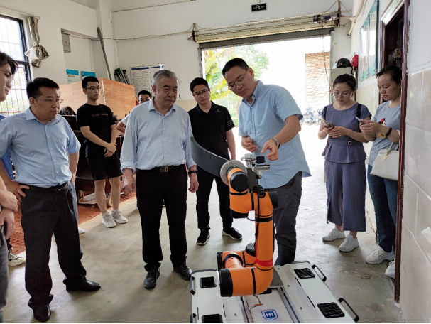 座谈会后,陈学庚院士参观了我院农机实验室,张喜瑞教授对农机团队的科研情况进行了汇报和实机展示,着重介绍了智能化割胶装备的研发进展,陈学庚院士肯定了农机团队的工作,并就展示的两种割胶装备提出了改进方案。