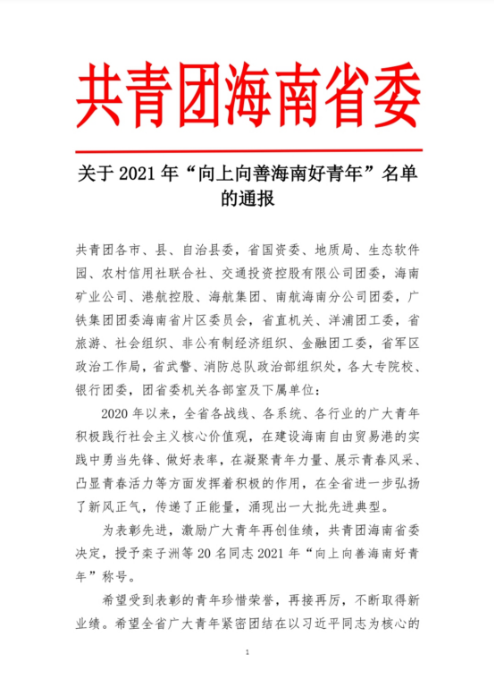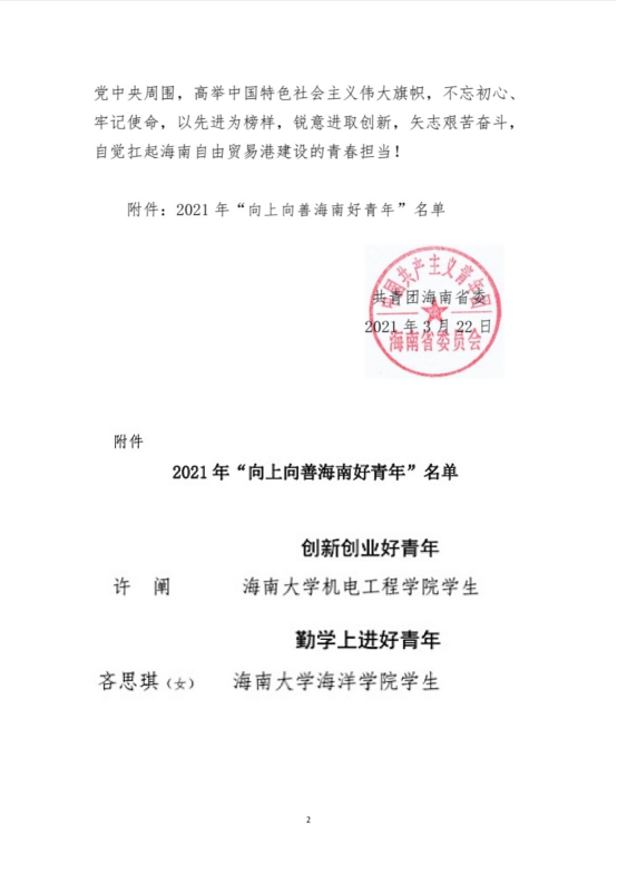 近日,我院学生许阐(本科生)被共青团海南省委评为2021年“向上向善海南好青年”之“创新创业好青年”。