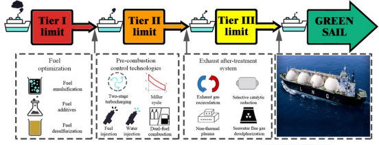 由于密集的海洋活动和低质量燃油的使用,海洋运输在运输部门的空气污染中占相当大的一部分。船舶虽然提供了便利的运输,但同时也排放了大量的有害污染物,特别是氮氧化物(NOx)和硫氧化物(SOx),对大气环境和人类健康都有重大的副作用。为了减轻全球航运对环境的影响,国际海事组织制定了从一级到三级更严格的排放条例,以减少船舶的排放。因此,需要开发更多的减排技术以满足未来更严格的法规,减少污染物排放。