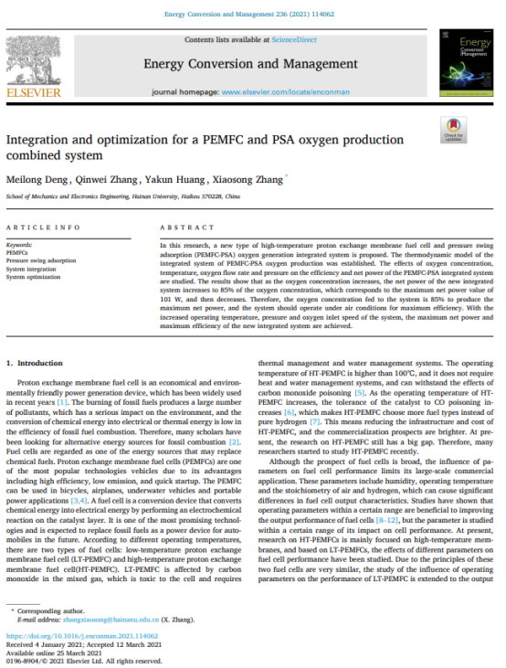 近日,yl7703永利2019级农业机械化工程专业的硕士研究生邓美隆以第一作者身份,导师张筱松教授为通讯作者,海南大学为第一完成单位。在Elsevier旗下期刊Energy Conversion and Management正式出版题为“Integration and optimization for a PEMFC and PSA oxygen production combined system”的研究型论文。该期刊属于SCI源刊,影响因子为9.709(2020年),中科院JCR分区:一区top期刊。